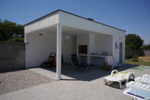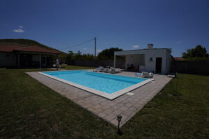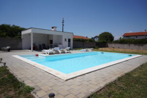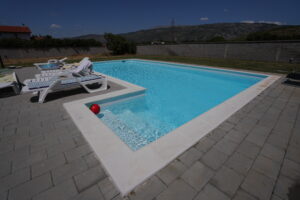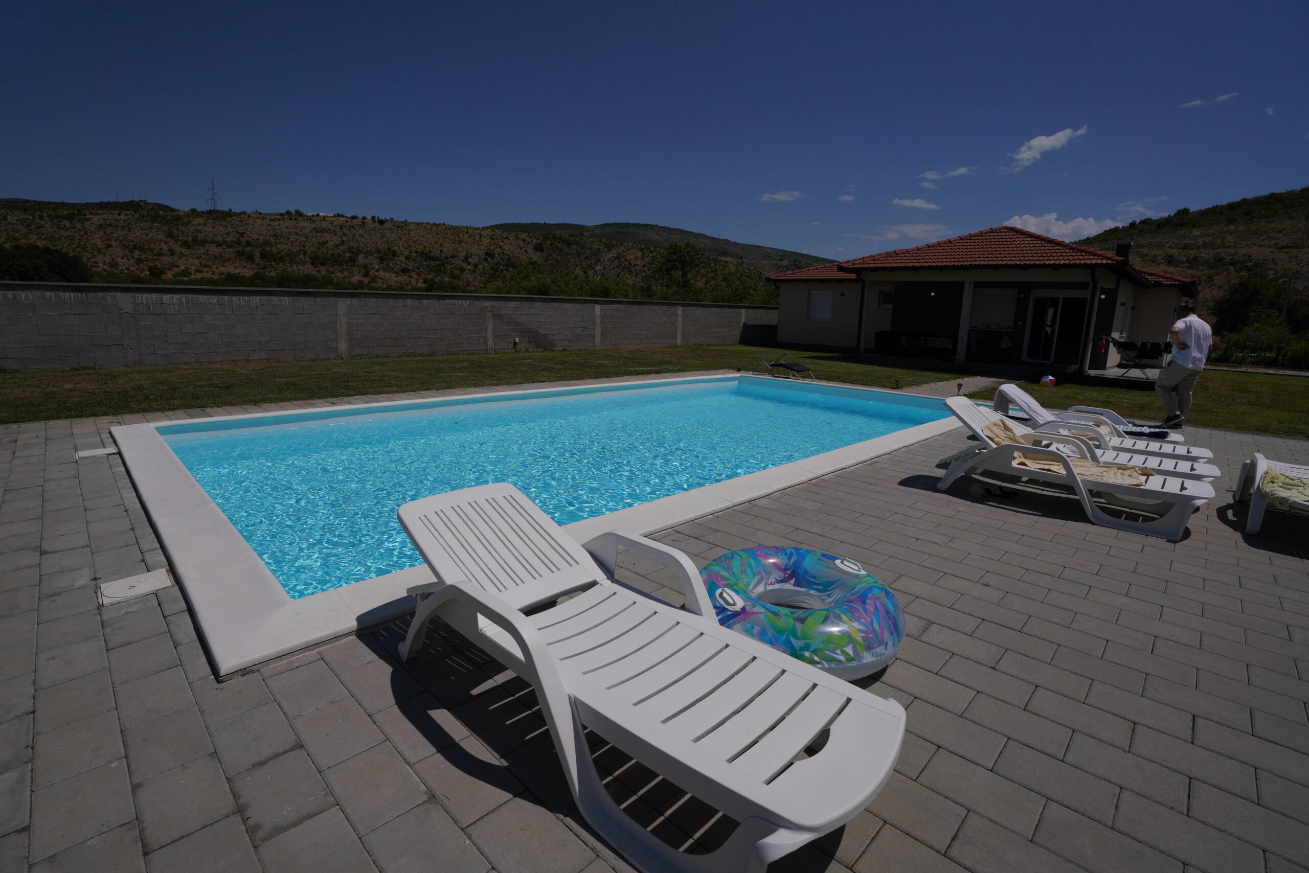 Prostor oko bazena oblikovan je kroz primjenu kvalitetnih podnih i završnih materijala, prilagođenih vanjskim uslovima, sa posebnim naglaskom na sigurnost, protuklizna svojstva i otpornost na UV zračenje. Time je postignut funkcionalan i estetski usklađen ambijent za boravak i rekreaciju. U sklopu projekta izveden je i prateći objekat uz bazen, koji je projektovan kao multifunkcionalna cjelina namijenjena odmoru, presvlačenju, skladištenju opreme i boravku korisnika. Objekat je konstruktivno i arhitektonski usklađen sa glavnim sadržajem, uz primjenu kvalitetnih termoizolacionih, hidroizolacionih i završnih sistema. Poseban fokus tokom realizacije stavljen je na integraciju bazena i pratećeg objekta u postojeći ambijent, uz poštovanje prirodnog okruženja i urbanističkih smjernica. Izvedeni su i prateći instalacioni sistemi, vanjska rasvjeta, kao i priprema za dodatne sadržaje u okviru dvorišnog prostora.